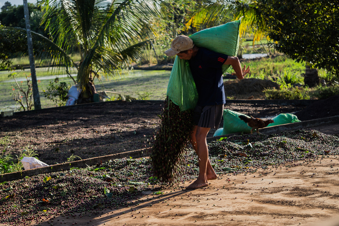 Để thu hoạch được cà phê, người dân sẽ trải một tấm bạt lớn dưới các thân cây rồi tuốt quả cho rơi xuống. Cứ thế, tấm bạt được kéo từ gốc cây này tới gốc cây khác.