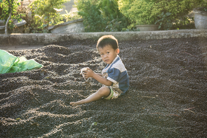 Nét hồn nhiên của em bé Tây Nguyên trong mùa thu hoạch cà phê.