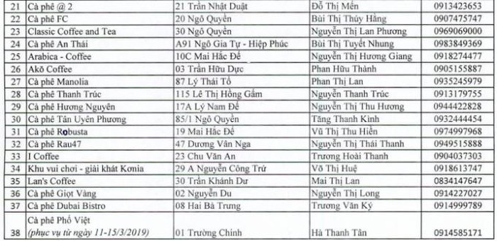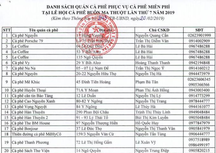Ngày 20/2/2019, UBND Thành phố Buôn Ma Thuột có Thông báo số: 243/TB-UBND, Danh sách các quán phục vụ cà phê miễn phí tại lễ hội cà phê Buôn Ma Thuột lần thứ 7 năm 2019.
