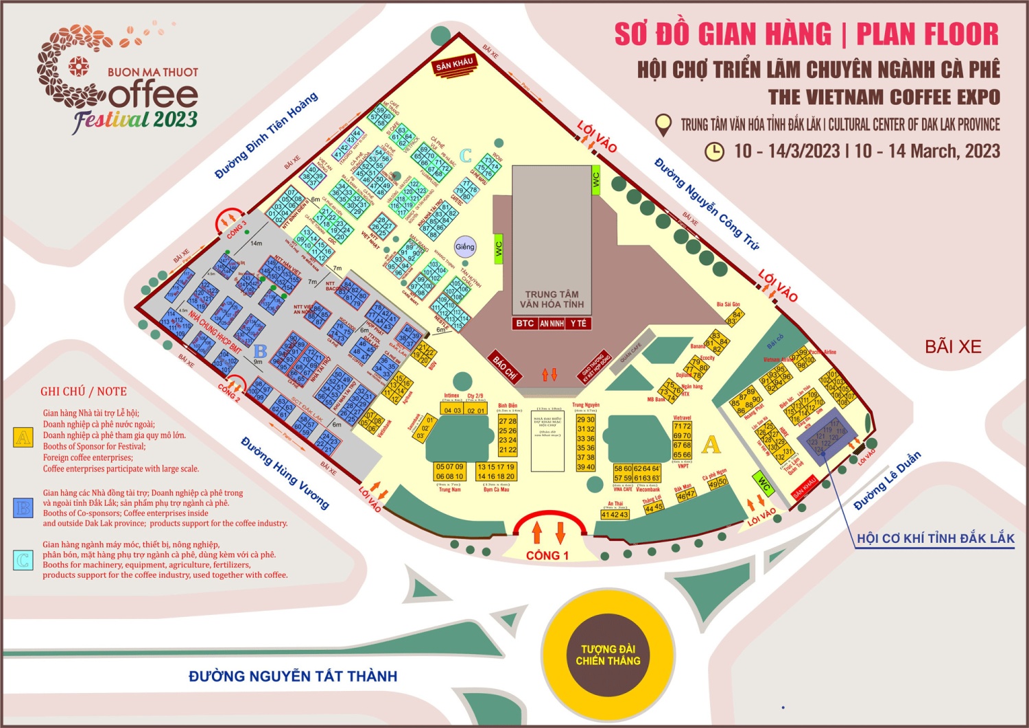 Hội chợ triển lãm bao gồm các khu vực: Khu A – Gian hàng Nhà tài trợ Lễ hội với 140 gian hàng; Khu B – Gian hàng các Nhà đồng tài trợ; Doanh nghiệp cà phê trong và ngoài tỉnh Đắk Lắk; sản phẩm phụ trợ ngành cà phê với 136 gian hàng; Khu C – Gian hàng các Nhà đồng tài trợ; Gian hàng ngành máy móc, thiết bị, nông nghiệp, phân bón, mặt hàng phụ trợ ngành cà phê, dùng kèm với cà phê với 122 gian hàng. Các gian hàng hiện đang được lắp đặt, xây dựng và sẽ hoàn thành trước ngày 08/3/2023 để bàn giao cho các công ty, doanh nghiệp.